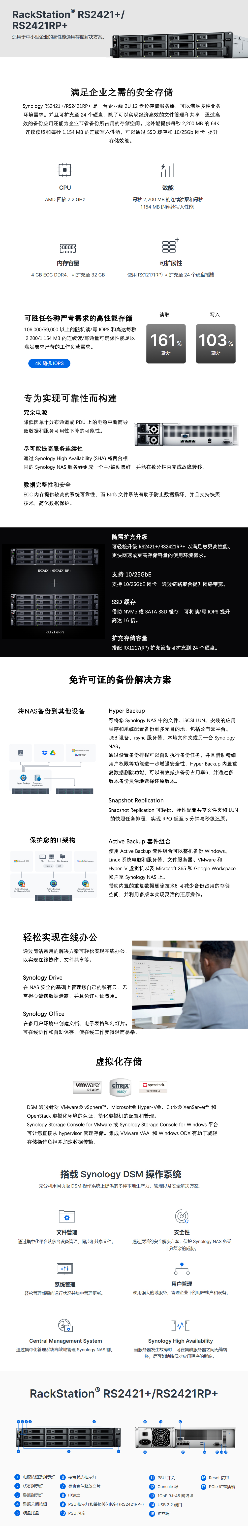 【成都群晖NAS总代理】群晖Synology RS2421+/RS2421RP+ 是一台企业级 2U 12 盘位存储服务器,可以满足多种业务环境需求。并且可扩充至 24 个硬盘,除了可以实现经济高效的文件管理和共享,通过高效的备份应用还能为企业节省备份所占用的存储空间。