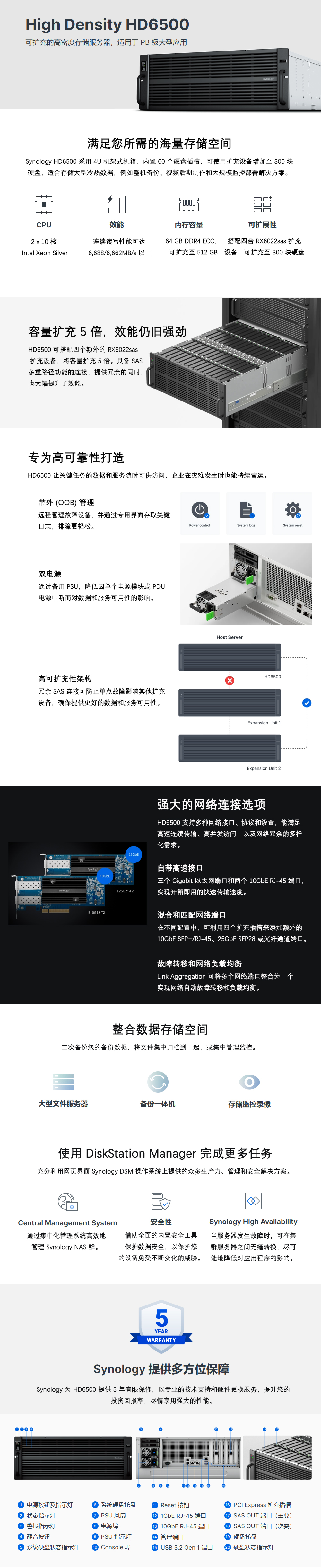 【成都群晖总代理】群晖Synology HD6500 采用 4U 机架式机箱,内置 60 个硬盘插槽,可使用扩充设备增加至 300 块硬盘,适合存储大型冷热数据,例如整机备份、视频后期制作和大规模监控部署解决方案。