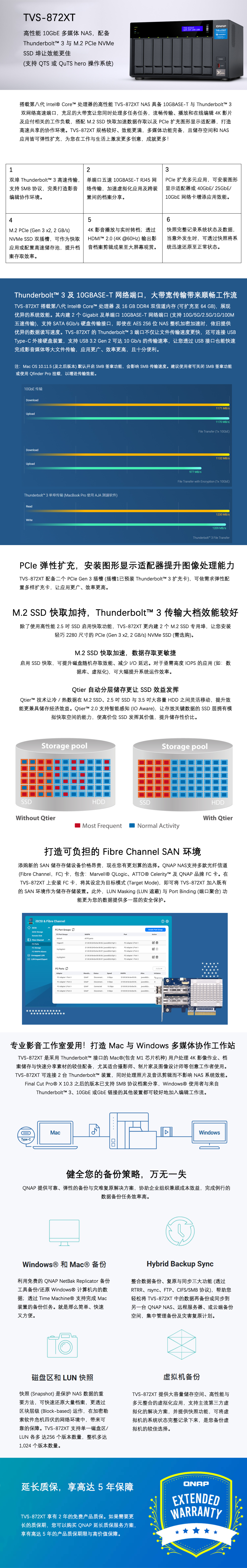 威联通TVS-872XT搭载第八代 Intel® Core™ 处理器, 具备 10GBASE-T 与 Thunderbolt™ 3 双网络高速端口,充足的大带宽让您同时处理多任务任务,流畅传输、播放和在线编辑 4K 影片及应付相关的工作负载,搭配 M.2 SSD 快取加速数据存取以及 PCIe 扩充图形显示适配器,打造高速共享的协作环境。TVS-872XT 规格较好、效能更满,多媒体功能完备,且储存空间和 NAS 应用皆可弹性扩充,为您在工作与生活上激发更多创意,成就更多!