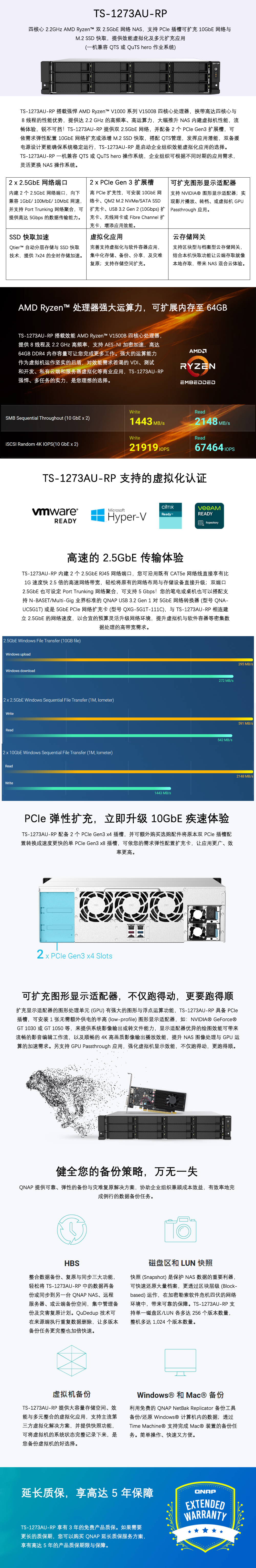 【成都威联通NAS存储代理商】威联通TS-1273AU-RP 网络存储搭载强悍 AMD Ryzen™ V1000 系列 V1500B 四核心处理器,挟带高达四核心与 8 线程的性能优势,提供达 2.2 GHz 的高频率、高运算力,大幅推升 NAS 内建虚拟机性能,流畅体验,锐不可挡!TS-1273AU-RP 提供双 2.5GbE 网络,并配备 2 个 PCIe Gen3 扩展槽,可依需求弹性配置 10GbE 网络扩充或添增 M.2 SSD 快取,搭配 QTS管理,发挥应用潜能,双备援电源设计更能确保系统稳定运行,TS-1273AU-RP 是启动企业组织效能虚拟化应用的选择。TS-1273AU-RP 一机兼容 QTS 或 QuTS hero 操作系统,企业组织可根据不同时期的应用需求,灵活更换 NAS 操作系统。