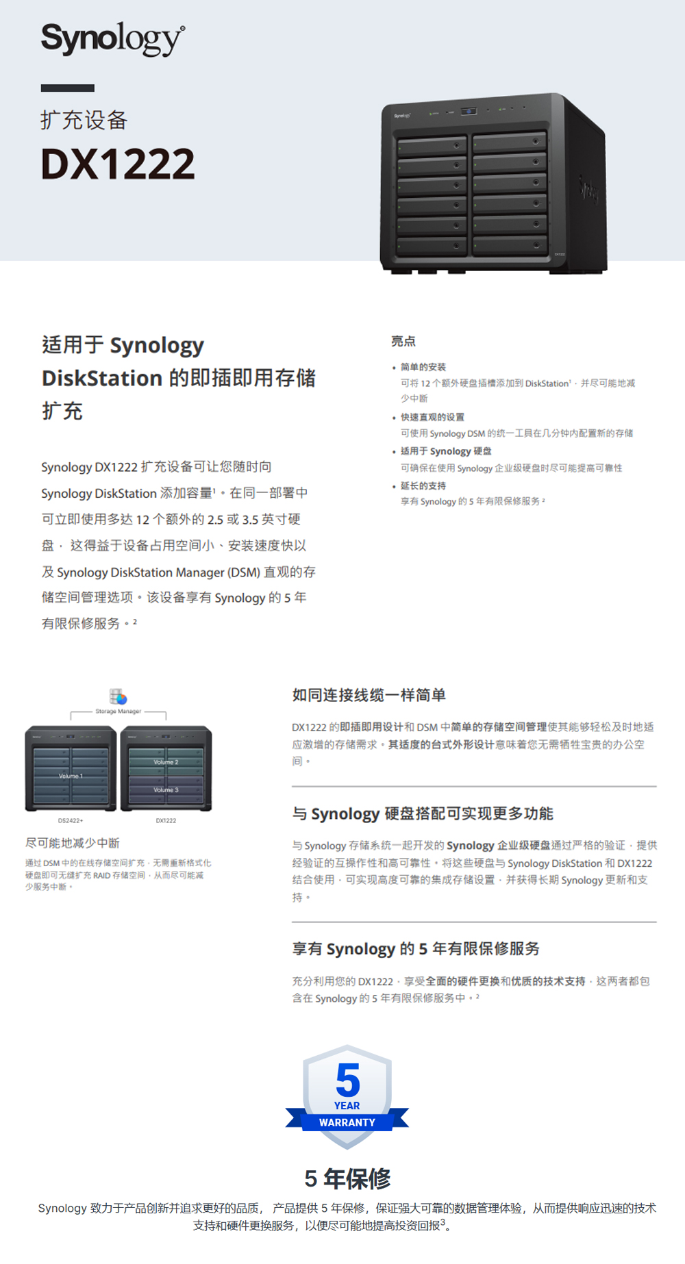 群晖Expansion Unit DX1222存储扩容柜,轻而易举就能将 Synology DiskStation 的存储容量增加 2~3 倍。四川群晖代理商