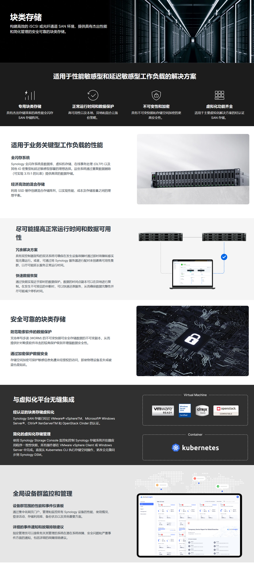 【成都群晖代理商】构建高效的 iSCSI 或光纤通道 SAN 环境,提供具有杰出性能和简化管理的安全可靠的块类存储。