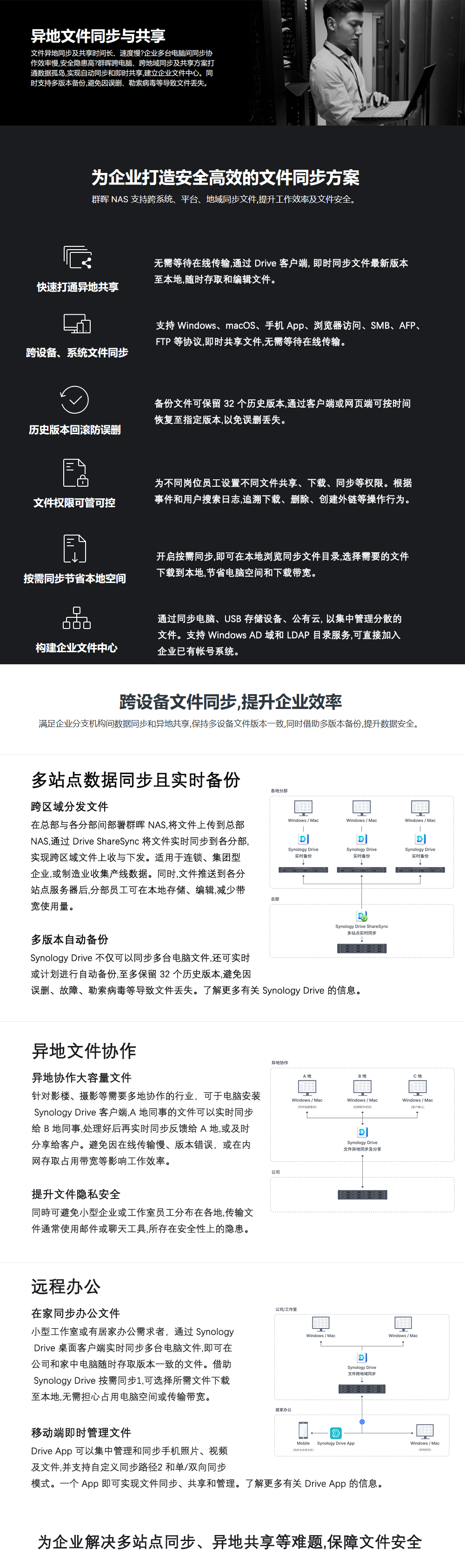 群晖 NAS 支持跨系统、平台、地域同步文件,提升工作效率及文件安全。