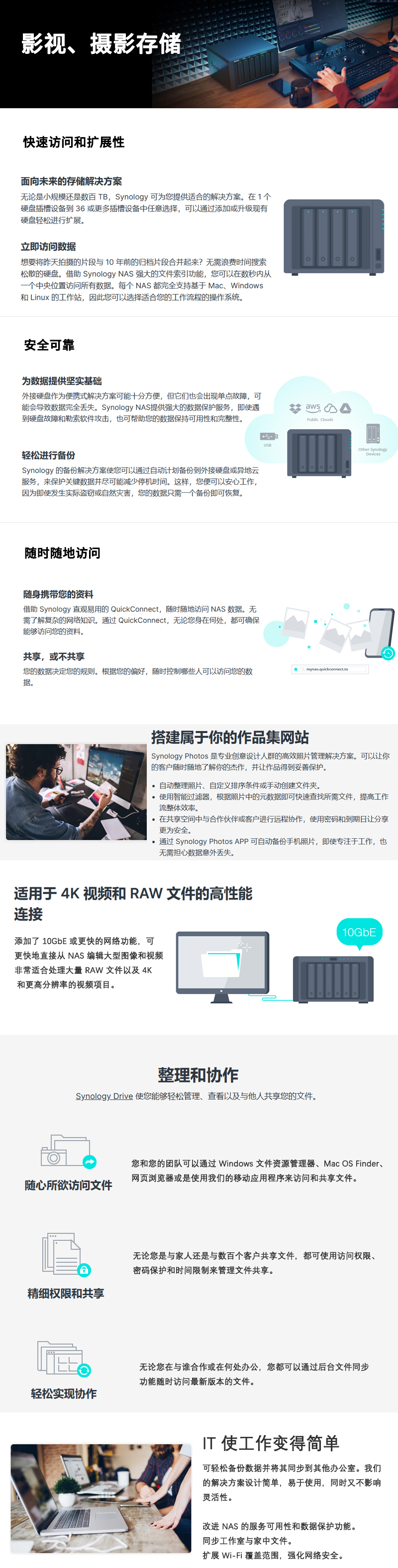 无论您是独自工作还是与世界各地的创意人员合作,寻找用于存储和管理文件的理想解决方案可能会十分困难。群晖Synology NAS 为您的工作流程带来高速度、简单性、安全性和无缝备份,让您能够专注于业务,而不会受技术所限制。
