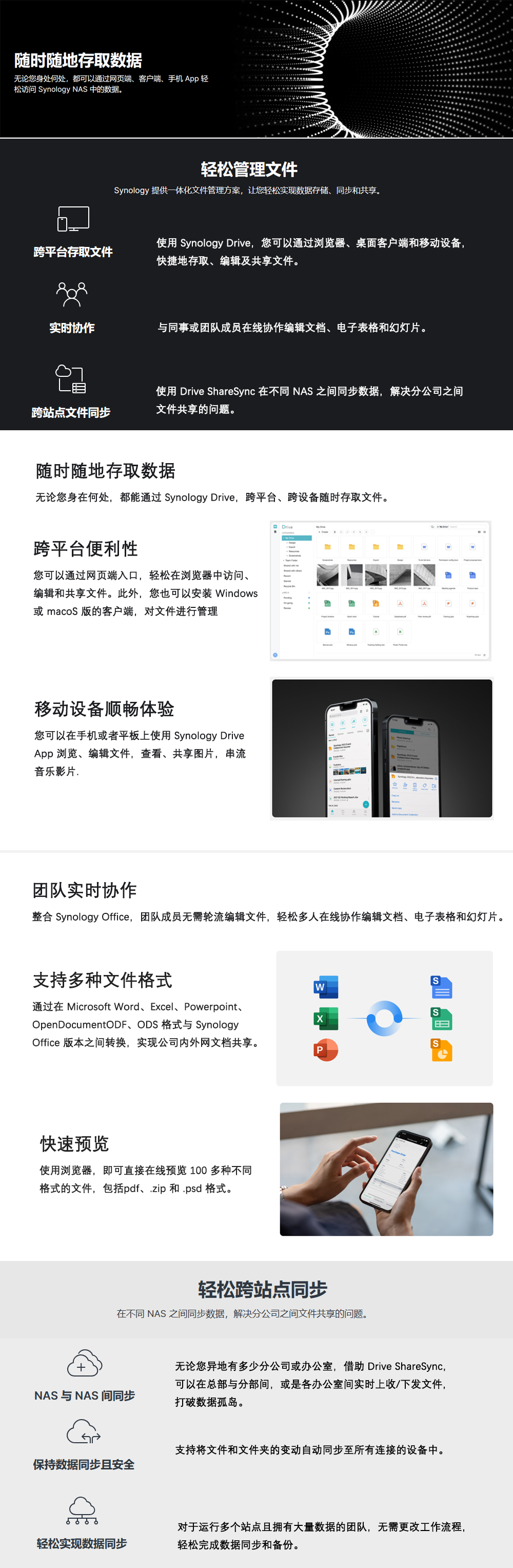 无论您身处何处,都可以通过网页端、客户端、手机 App 轻松访问 Synology NAS 中的数据。
